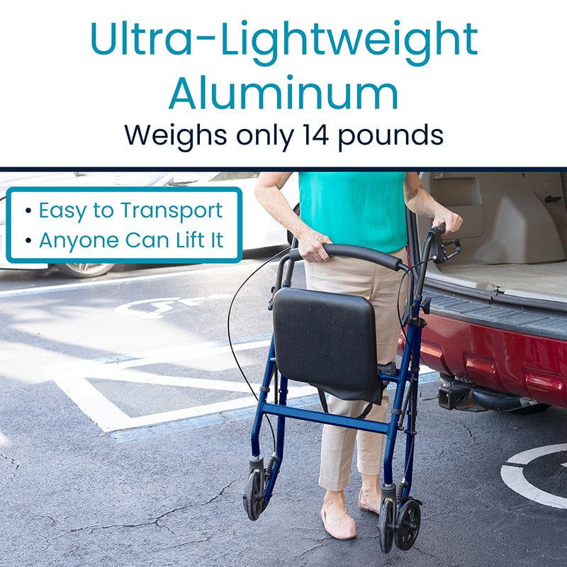 The carefully crafted, lightweight aluminum frame of the Lightweight Rollator weighs a mere 14 pounds, allowing you to easily transport and store this rollator when it is not in use. The strength of the aluminum frame safely supports up to 300 pounds, for greater peace of mind.